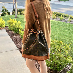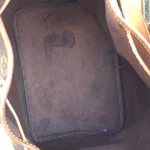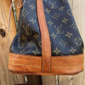 Authentic Louis Vuitton Noe Monogram Bucket Bag with COA from authenticatefirst. Made in March of 1988 in France. It has date code AR8911. Heat stamp on the lower outer plaque and on the handle at the center. The base measures 10 1/2" by 7 3/4". It is 13 1/2" tall. The shoulder strap is 27" long right now, but it has two buckles and will adjust. Vachetta has darkened with age. Bottom has staining and spots. The interior has some spots, but has been cleaned. Drawstring is a replacement.