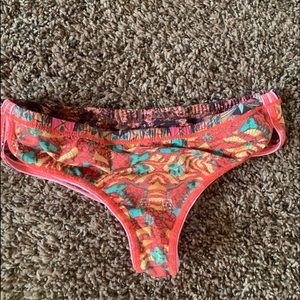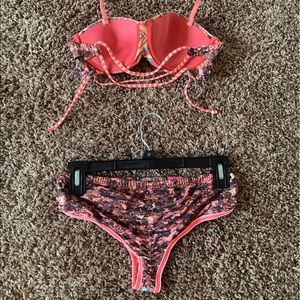 Top can be strapless or it has strings too. Back of the top is super cute and strappy. The bottoms are rouched and flattering. The bottoms also are reversible. Only worn a few times and like new condition. Great for summer and the beach or a pool day. THE TOP IS A SMALL AND THE BOTTOMS ARE A MEDIUM BUT FIT LIKE A SMALL. WILL SELL SEPARATELY.