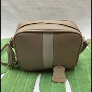 I usually ship in 24 to 48 hours. New Good Looking Neutral Vegan Cross Body Bag. Zipper on top. Pocket inside of Bag. Strap is 1/2 “ Wide & is 48” long. 8” Across Front. 6.25” Ht. 2-1/4” Across Bottom of Bag. Excellent Condition.