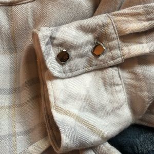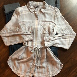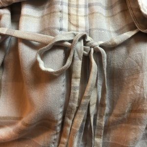 EUC, long sleeves, hidden front buttons, two pocket blouse with silver embedded detail. Silver buttons at cuffs and neck. Waist tie option. Soft and comfortable.