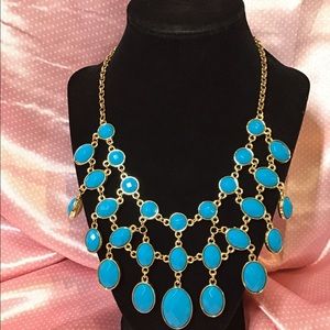 A one of a kind vintage costume piece it is a reversible necklace with turquoise on one side and tan on the other both with a gold tone base. It fans across your chest with cascading jewels. It flows beautifully and has a 2 inch extender and clasp to allow you to where it short or long as shown in the pictures. This is truly a go to piece. Brand new never worn. Smoke and pet free home