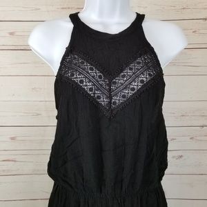 Lots of stretch this shortsall romper has crochet lace at the bottom. Open back with tie at the top for a halter top type style. Made in USA.