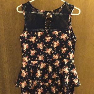 No tags stretchy, cute. It is 18 inches from pit to pit and from the shoulder to the hem it’s 33 inches. Lace detail at the top comfortable stretch fitted bodice and flare at waist