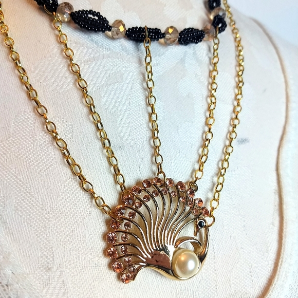 Black, gold, champagne and pearl adorn this beautiful bib-style necklace! Made with a triple strand of black beadwork and champagne-colored crystal beads. Gold chains hold a large peacock pendant, lined in black onyx, a large creamy pearl, and more crystals.