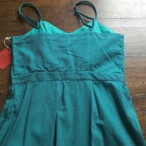 Green bra cup dress with thin vertical navy blue stripes. Adjustable thin straps. Side zipper. Size L. 100% cotton. A small pull/snag on back (see pictures). New with tag.