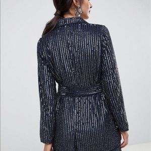 Beaded embellished suit set by ASOS DESIGN. Midnight blue suit with cropped ankle pants and suit jacket with tie belt. Color is midnight blue. Worn once and for photoshoot. Like new condition.