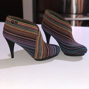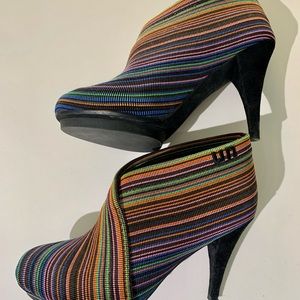 Gorgeously striped multi coloured ankle boot with spike heel.