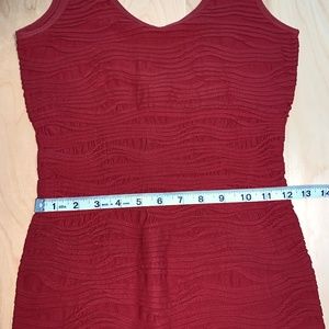 I am not sure what brand this dress is however, it does have a very intriguing design in the fabric in front and back. The dress is above the knee and intended to be form fitting. This dress has no flaws and is ready to impress. See measurements of dress in the pictures. The tag says this dress is S/M and is 100% nylon. Please take advantage of the bundle discounts 🛍. Thank you for looking 👀!