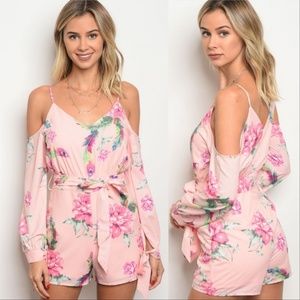 This BLUSH PINK romper features a floral print with long sleeved cold shoulder details, lovely v-neckline, ties at waist & sleeve ends. Pair with statement earrings for a fabulous look! 100% Polyester