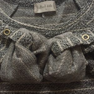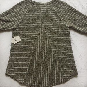 Altar'd State grey and white striped sweater with specks of gold. Sleeves are three quarter length and are secured with gold buttons. It is in excellent condition with no rips, tears, or stains. It has never been worn and has tags (the tag came like that).