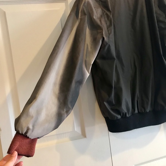 In-Crowd By Celebration! Dark Gray Vintage Bomber Jacket with very cool photo degradation on left sleeve. Belted collar. Size Medium.
