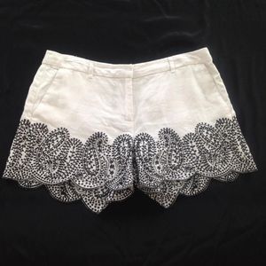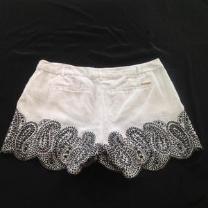 These Michael Kors are a classic 100% linen in a white with black paisley embroidered hemline. Sz 8.