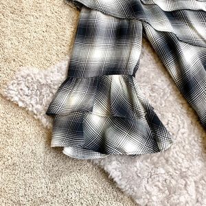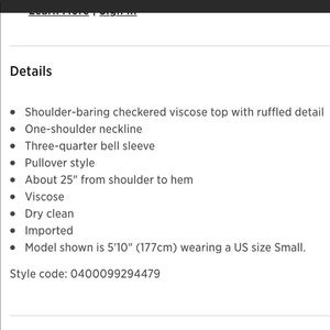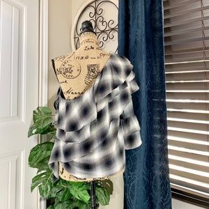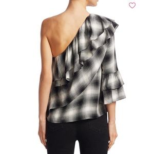 New super cute Alice and Olivia top that is shoulder barons on one side . Effortless style to wear day to night ..This top has ruffle detailing throughout with ruffled bottom arms details as pictured