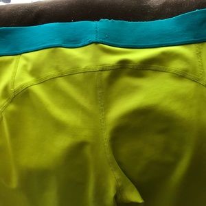 Nike Pro capris. These are lemon-lime color with a turquoise band. Lots of wear left. Inside band has some lint balls.