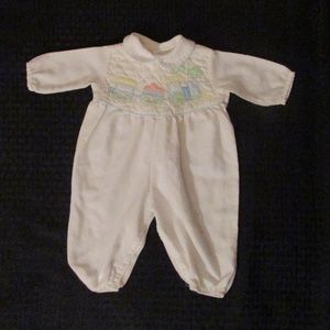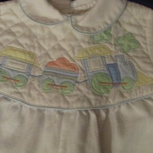 Absolutely adorable romper for baby. This vintage romper by Patsy Aiken features a quilted top design. Decorated with an embroidered train, this romper is truly one of a kind! Excellent condition. No defects. Size 3 Months.