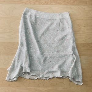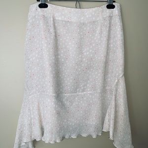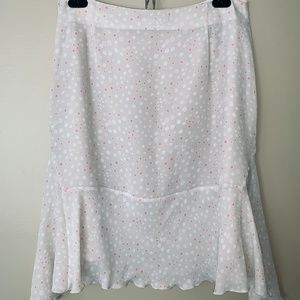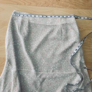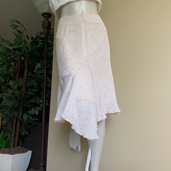 This skirt has an inner liner and outer sheer fabric adorned with pink dots. It has a mermaid fit to flare style. It has an inner liner with sheer fabric on the exterior. The waist is 32” and the length is 22". Excellent condition. Like new. It says size 2 but according to US size charts I would say its a womens large. See measurements in pictures. Please take advantage of the discount by bundling three or more listings 🛍 Thank you for looking 👀!