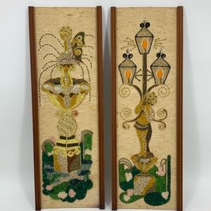 Vintage wall art mid century modern MCM pebble gravel rock art courtyard fountain lantern street lamp beautiful graphic boho bohemian traditional farmhouse