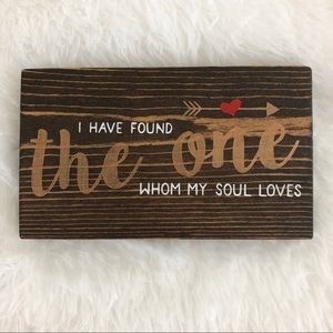 I have found the one who my soul loves sign. The perfect gift for a wedding, anniversary, engagement or bridal shower. Measuring at approximately 5.5” x 3”, this sign is stained in espresso and hand painted with white, red and bronze metallic paint.