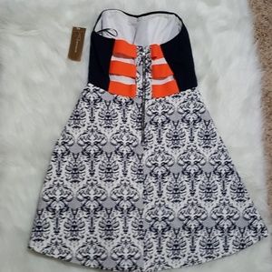 This is a strapless dress from Francesca's. Dark navy blue and white print with bright orange bandage style straps on the back.