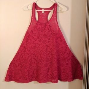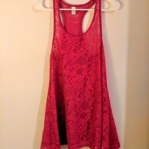 No Brand Beach Cover-up Lace Tank Dress. HOT PINK razorback FULL ALine tank dress Bathing Suit Cover-up. Stretch floral lace. Soft edge trim on neckline & around arms/back. Bright color. See thru (see pic w/hand or pen visible.) Great fullness for gal w curves!