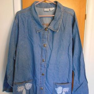 Blair Embroidered Denim jacket 100% cotton. Size 3X. Appliquéd with leaves and edged with white embroidery. Gently used and in good condition. Measures: Length 30”; Sleeve from dropped shoulder seam to cuff is 24”. Bust from buttoned edge around underarms to front edge is 60”. Around bottom is 60”.