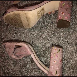 Open toed heel sandals with embroidery detail on 3 1/2 inch heel