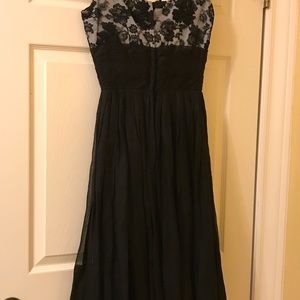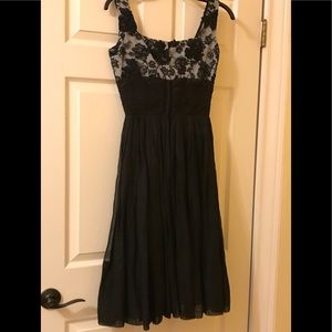 Lovely LBD cocktail number. Just amazing. The bodice is lace over gray fabric. The lace has some raised flower appliqué. The skirt is full. The skirt part is lined in black. Gently worn preloved condition. There are darts on bust. No stretch. Please view photos for further description. This is a true vintage item. It was size 8 but looks like modern 2.