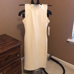 Brand new with tags. Looks like some makeup is on the front neckline. It was there when purchased. Should be able to be wiped clean. You can see it in the second picture on the left side. Great dress for a bridal shower or rehearsal dinner.