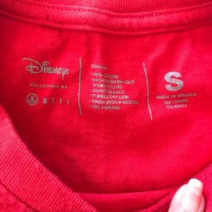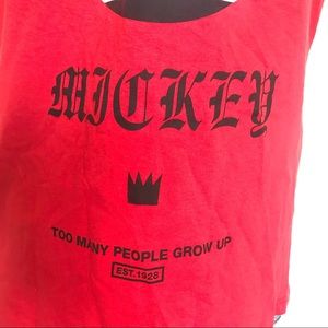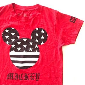 Red American flag Mickey Mouse logo Disney t-shirt, with the words “Too many people grow up” below the graphic and the brand NEFF on the sleeve it’s a long short sleeve shirt. In excellent Used condition. No stains tears or rips.
