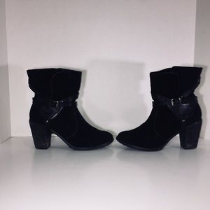 Urban Outfitters Restricted black genuine leather and suede motorcycle boots. Stacked heel for comfort and stability. Leather straps and buckle that wraps around bottom, front and ankle. Awesome tread on the sole for wear in all weather. Lightly worn but good condition and really cool boots! The heels are too high for me now.