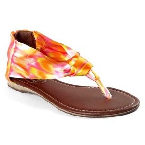 Gorgeous thong sandal features multicolor tie dye scarf print. Thong design with back zip allows for a secure fit. Paired with a shorts or skinny jeans, you just cant miss. Perfect spring sandals ❥
