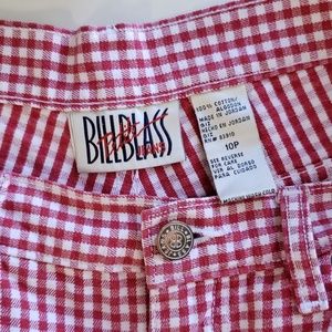 VINTAGE BILL BLASS petite jeans red and white gingham print. With riveted side slits,and high waisted,belt loops all the way around .These are perfect for a summer outing. Cute with a white cropped tank or tee.In like new condition no spots, snags or stains.Waist measures 31"exactly.With a 4"inseam unfolded, will hem to requested inseam measurement upon request with purchase!:)These are a cotton denim,not a linen.
