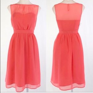Bust 15”-16 1/2”, waist 14”, Length from shoulder to bottom hem 38” Condition brand new with boutique tag. Zipper closure at side and button closure at back of neck. Sleeveless. chiffon. Fully lined. Midi Length. Color: Salmon