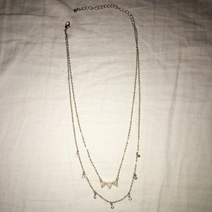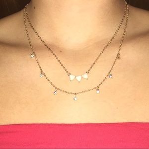 This necklace is double stranded with one longer than the other! First chain is 3 rose quarts colored stones and the second chain is 7 individual silver crystals.