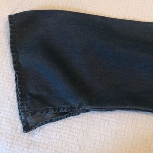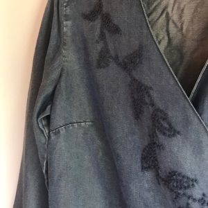 Beautiful J. Jill 100% tencel indigo top. Wrapped and tied front with button closure on the inside. Embroidered vine down the front. Slight bell sleeve with a vent on bottom. See pic.