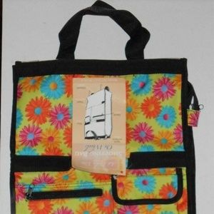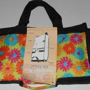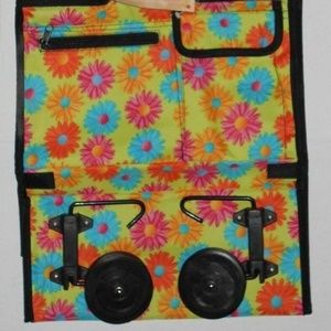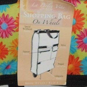 Beautifully Designed Shopping bag on wheels. It is water resistant. It has special reinforced handles, Velcro closures, zippered pockets, rugged construction, and collapsible wheels. It has a large compartment, 2 pockets, 3 handles, 2 collapsible wheels with stand attached. This shopping will be great for the summer and beyond or it will be a great present. HTF