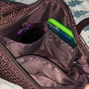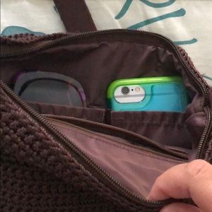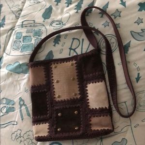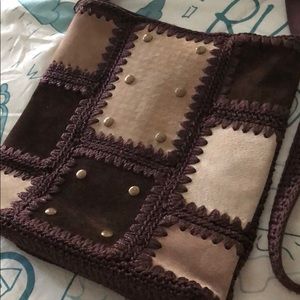 Perfect shoulder bag,or crossover bag.Very well made nice quality dark brown and tan, Suede patches design on the front side of bag with bronze buttons For embellishment. Crochet bag.