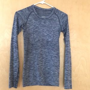 This Henley blue lululemon running shirt with thumb holes is for sale! The tag is not attached to the shirt any longer but was photographed for reference. Fits snugly.