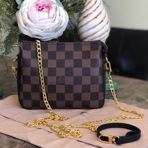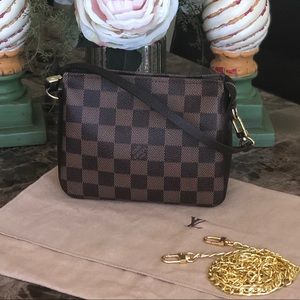 What a beautiful, perfect piece! Damier Ebene. CAN BE USED AS A COSMETIC POUCH, CLUTCH, HANDBAG, SHOULDER BAG, CROSSBODY🌺 made in France, date code pictured SP1909. Measures appx L7” H5.5”. LIKE NEW CONDITION INSIDE & OUT, including the authentic original leather strap. Includes a free unbranded chain strap. FITS AN IPHONE 8 PLUS, GLASSES, KEYS, SMALL WALLET🌺 a nice alternative to the more expensive Eva or Favorite bags. please ask any questions. I’m a Posh Ambassador and Top Rated Seller 😊
