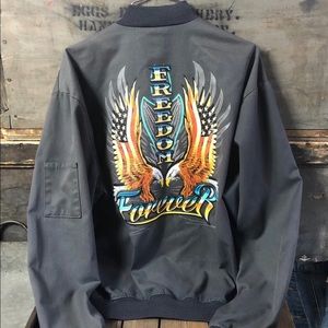 This is a one of a kind unisex “gas station attendant” bomber jacket. Professionally placed American Freedom Forever image on back gives this a unique vibe . Sz Large