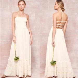 Perfect summer maxi dress in a beautiful cream color. Has smocked halter top, open back with elastic straps. Bottom is lined with elastic waist. Quality made and simply lovely.
