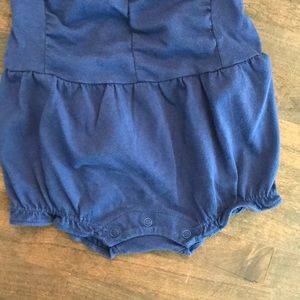 Navy blue romper with white embroidery.