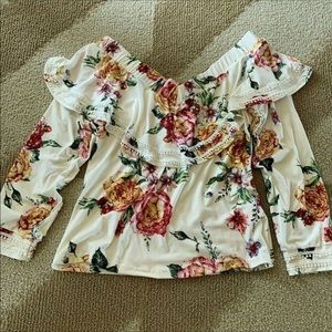 Gorgeous Bohemian Blouse. Flattering off the shoulder look. This top has a white and floral print. So Pretty and the Fabric is so Soft