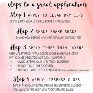 How to Apply LipSense: Apply three layers of lip color. Letting it dry between each layer. After the layers are dry apply LipSense gloss to lock in moisture!