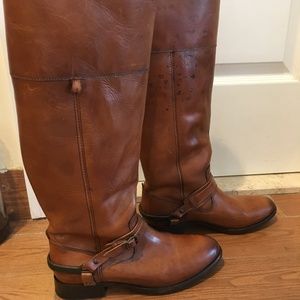 Women’s Frye Lindsay spur riding boot, 8M. Worn only once (calves a bit too wide on me). Beautiful tan color, but does have some color stains one of the boots and a slight scratch on one toe area. Please look closely at photos for condition.