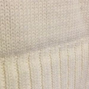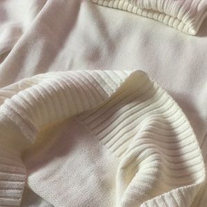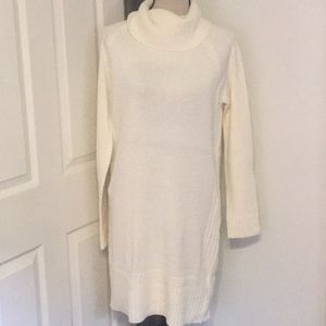 *Pretty ivory turtleneck sweater dress has simple detail with the long sleeves, the softness of the material, the cable knit trim on the end of the sleeves, on the turtleneck, on the bottom & down the sides of the dress