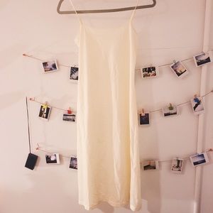 Two-piece midi dress with a sheer floral outer shell and an inner slip. The slip has adjustable straps, with slight pink staining.