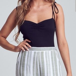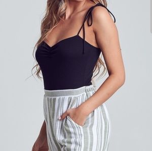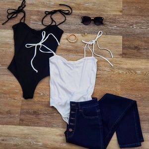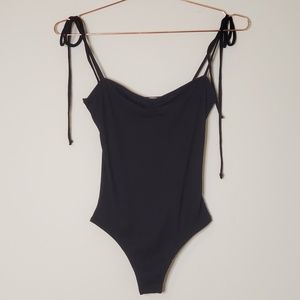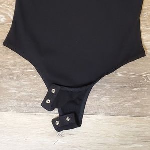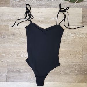 Black Bodysuit, adjustable sleeves in ties. 96% Rayon 4% Spandex.