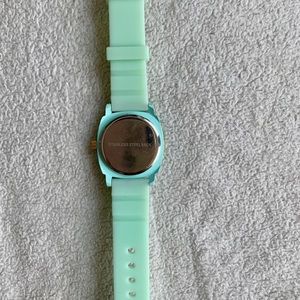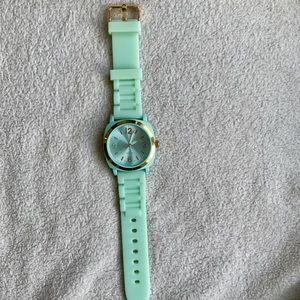 Anthropologie teal & gold rubber watch with gold color numbers & gold color hardware. Stainless steel hardware. Needs a new battery.