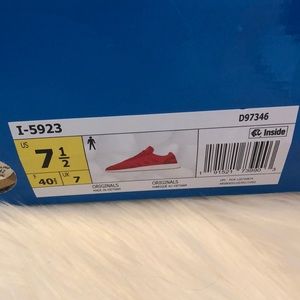 New in full box, Adidas I-5923 in bright red with “gum” sole. Awesome shoes, VERY comfortable! These have been tried on but not worn outside. Men’s 7.5 = women’s 8.5 & I feel they run a half size bigger (I wear a 9 Nike but 8.5 Adidas)